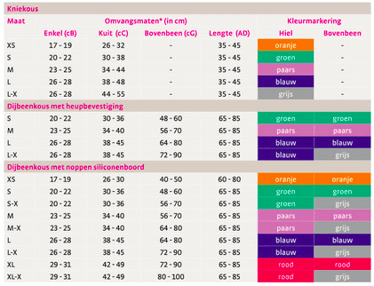 - Matensysteem met een kleurcode voor snelle en eenvoudige keuze van de kousmaat